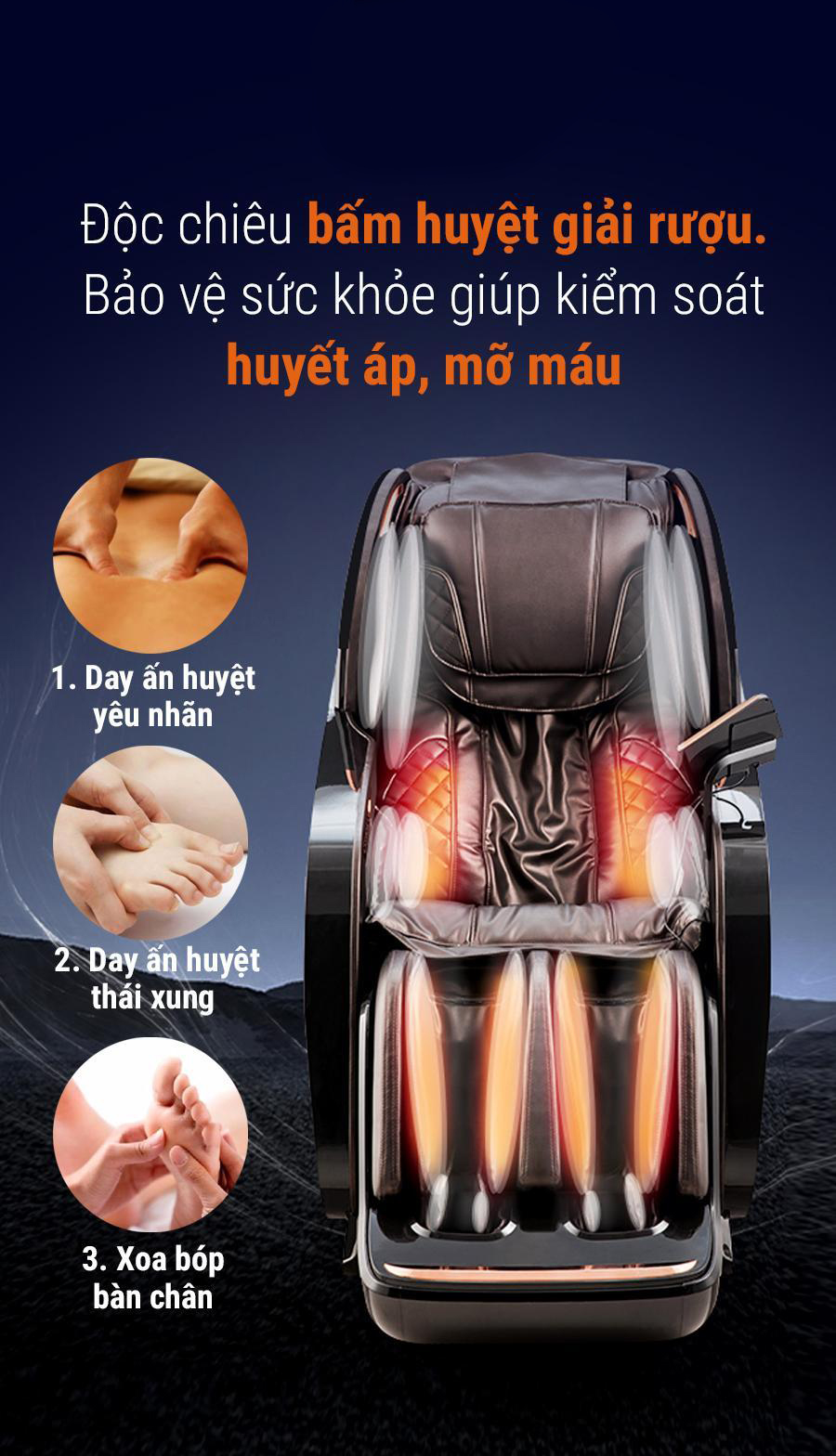 Khi bật bài giải rượu trên OKAZAKI JS 3000, ghế sẽ massage toàn thân, hệ thống túi khí sẽ hoạt động giúp máu lưu thông tốt hơn, đồng thời hệ thống bi lăn sẽ tập trung vào 2 huyệt đạo Yên Nhãn và Thái Xung cùng túi khí bao trọn bàn chân cũng được bóp và kéo dãn liên tục. Điều này sẽ kích thích hệ thần kinh giúp giải rượu nhanh chóng.