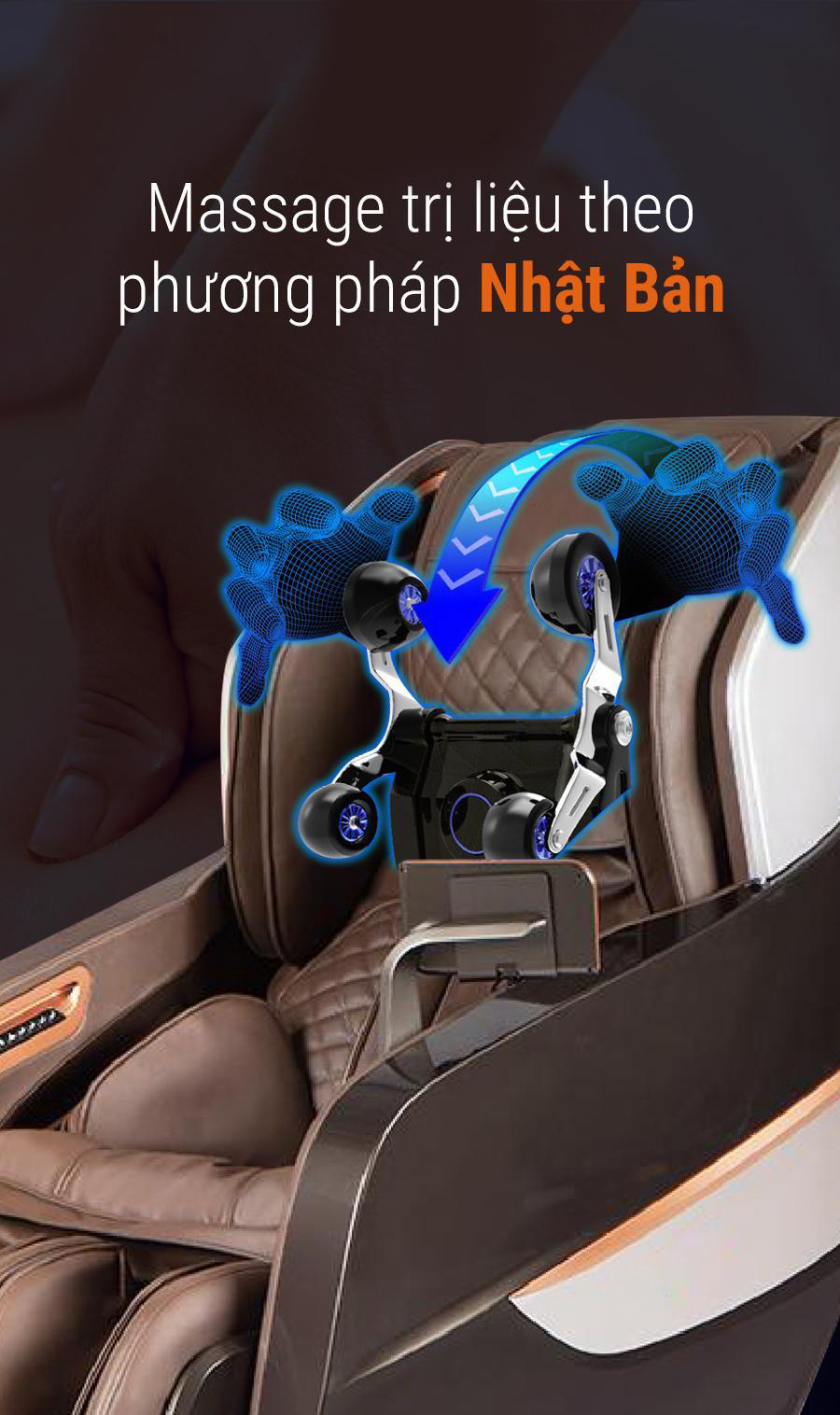 Ở bài tập massage theo liệu pháp Nhật Bản, các viên bi lăn di chuyển với tốc độ chậm kết hợp túi khí giữ chặt cơ thể và đấm bóp liên tục, tạo cảm giác massage như bàn tay con người.