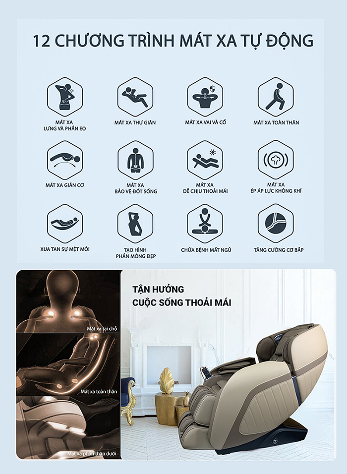 - 12 chương trình massage tự động và chế độ massage thủ công tùy theo sở thích cá nhân.