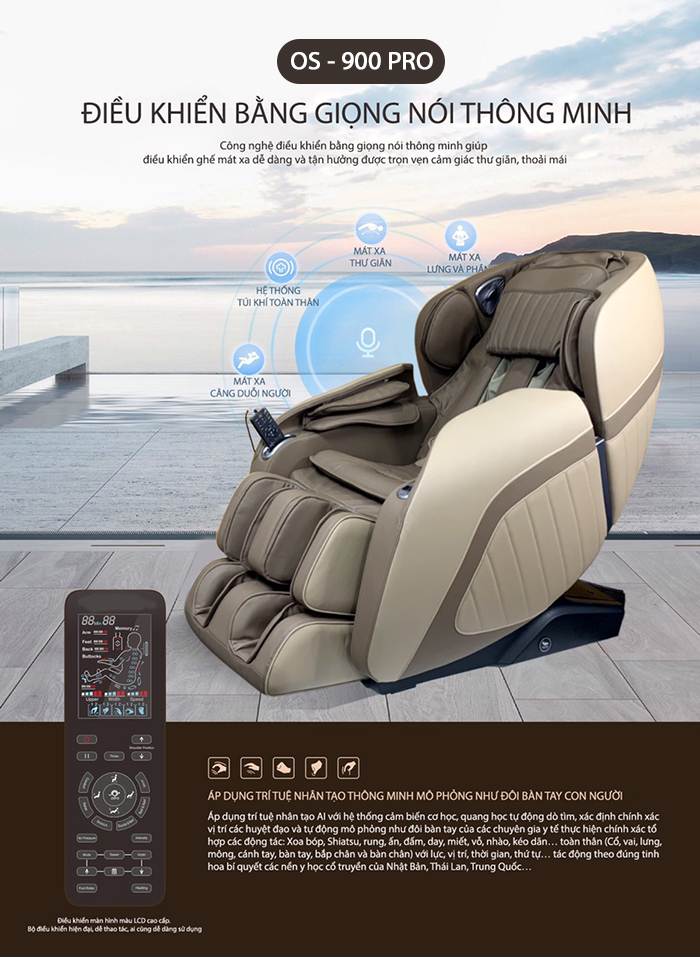 - Công nghệ điều khiển bằng giọng nói thông minh giúp điều khiển ghế mát xa dễ dàng và tận hưởng được trọn vẹn cảm giác thư giãn, thoải mái