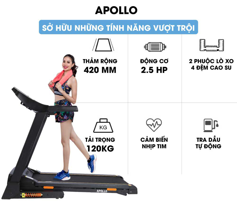 - Luyện tập mỗi ngày cùng với máy chạy bộ điện Apollo không chỉ rèn luyện sức khỏe dẻo dai, hệ tim mạch khỏe mạnh, giúp giảm cân, duy trì vóc dáng hoàn hảo nhất.