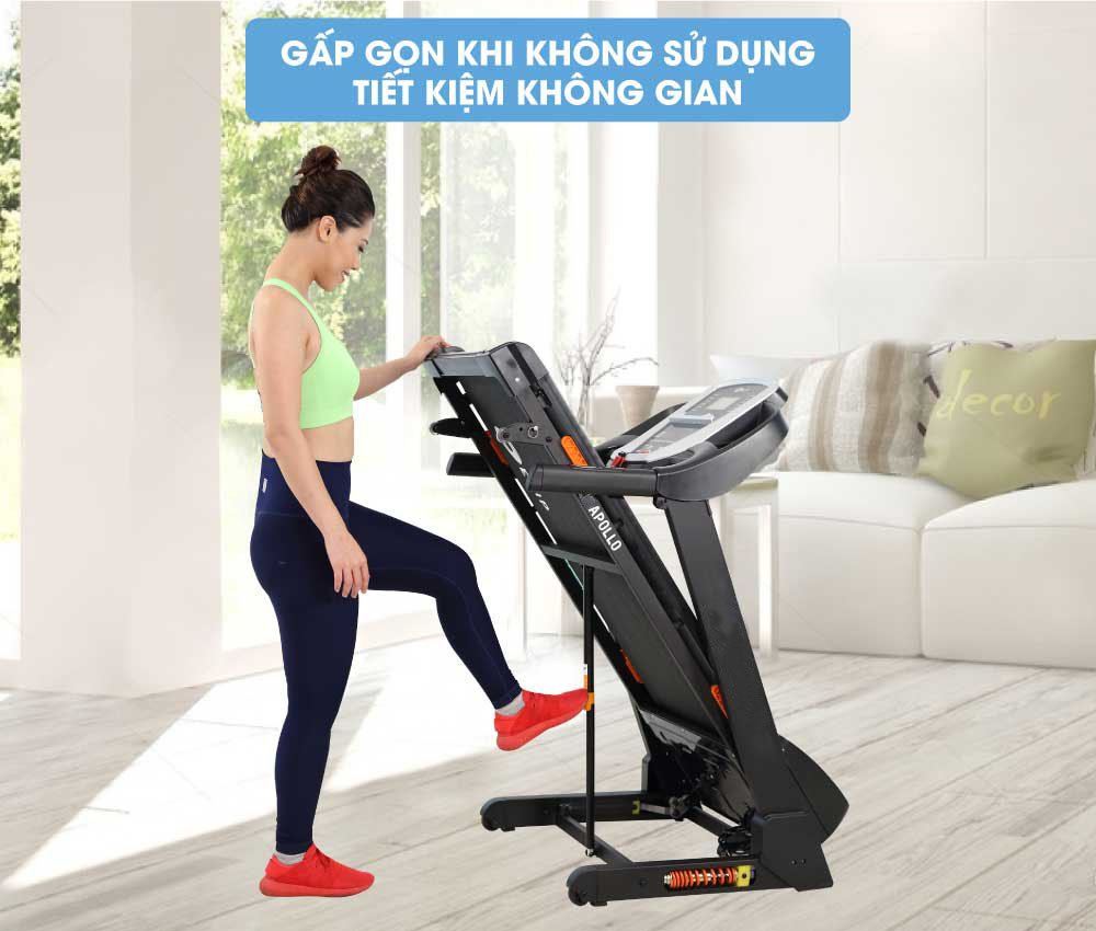 Máy chạy bộ điện Apollp có tích hợp Piston thuỷ lực giúp người dùng có thể gấp gọn máy khi không sử dụng để không giạn gọn gàng hơn. Di chuyển mây cũng trở nên dễ dàng hơn nhờ vào cấu tạo bánh xe.