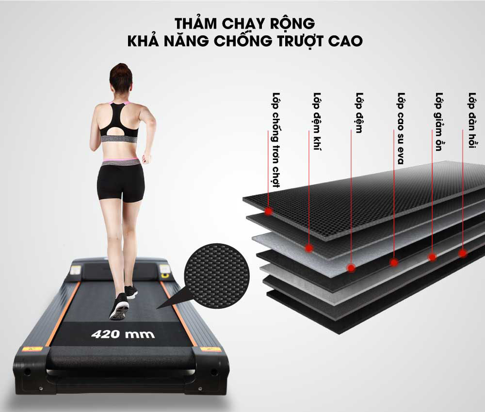 Ứng dụng hệ thống giảm sốc lò xo phuộc nhúng ngay đầu máy giúp hoạt động ổn định hơn, bền hơn, cùng công nghệ tra dầu tự động mới bảo vệ tốt đường truyền thảm chạy và động cơ.