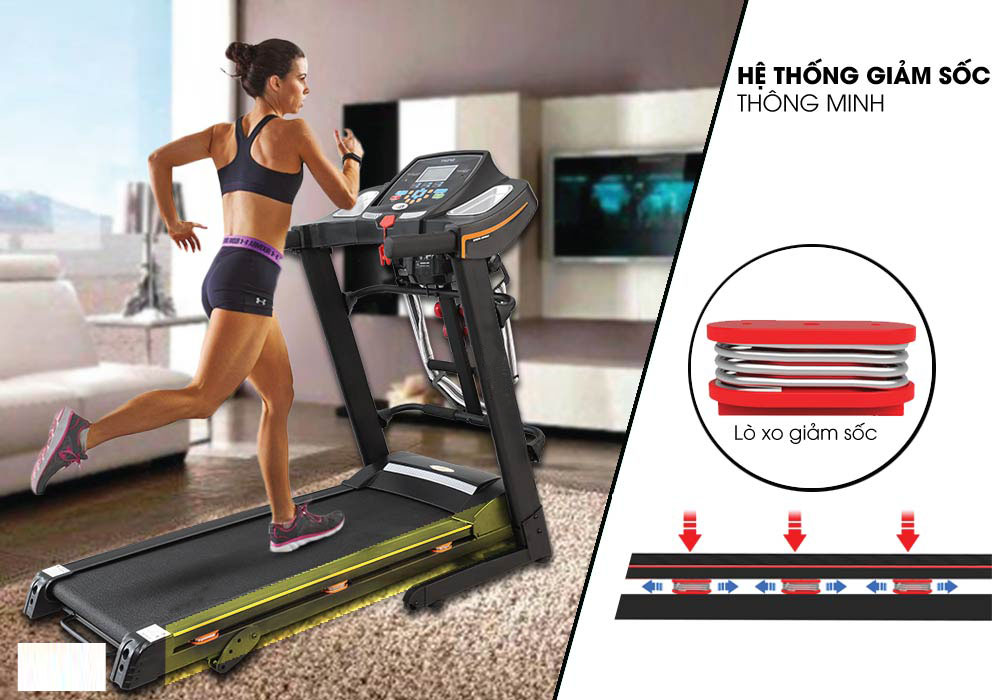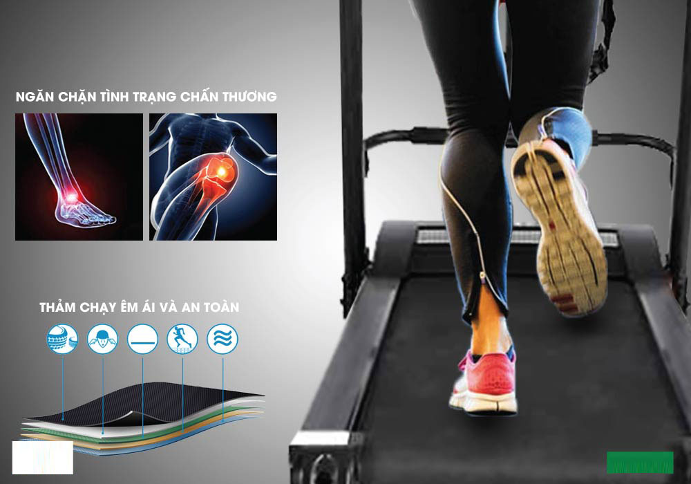 Máy chạy bộ điện đa năng iLike iE04 được trang bị lò xo giảm sốc trải đều thảm chạy, giảm chấn thương cực tốt. Kích thước thảm lớn, giúp thoải mái luyện tập chạy bộ hơn. Chất liệu cao cấp êm ái, chống trơn trượt cực tốt dành cho người sử dụng.