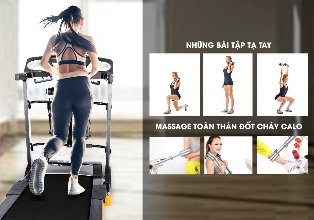 Ưu điểm nổi bật của Máy chạy bộ điện đa năng SU - 619 tính đa năng nhưng dễ sử dụng và điều chỉnh dễ dàng nhờ và bảng điều khiển chi tiết. SU - 619 giúp luyện tập giảm cân nhanh hơn nhờ vào các bài đa dạng kết hợp chạy bộ, đi bộ, gập bụng, tập tạ tay và massage toàn thân.