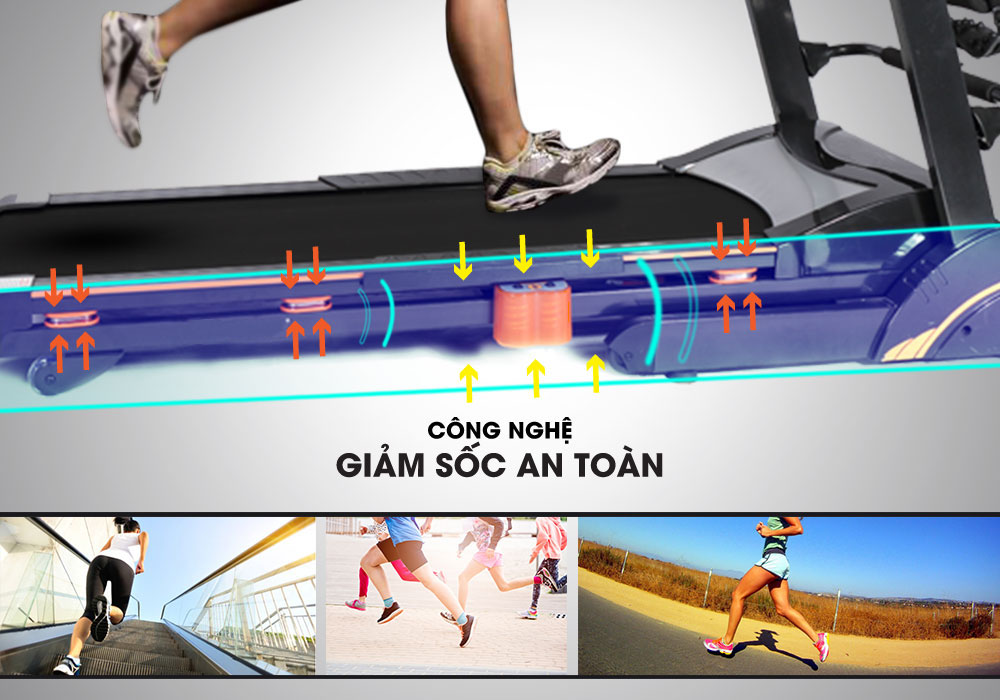 Máy chạy bộ điện đa năng SU - 619 được trang bị hệ thống giảm sốc vượt trội với 6 đệm cao su trải đều thảm và 4 lò xo phuộc nhúng giảm sốc, tránh chân thương chân. Đặc biệt, giúp máy có tuổi thọ lâu hơn dù sử dụng liên tục.