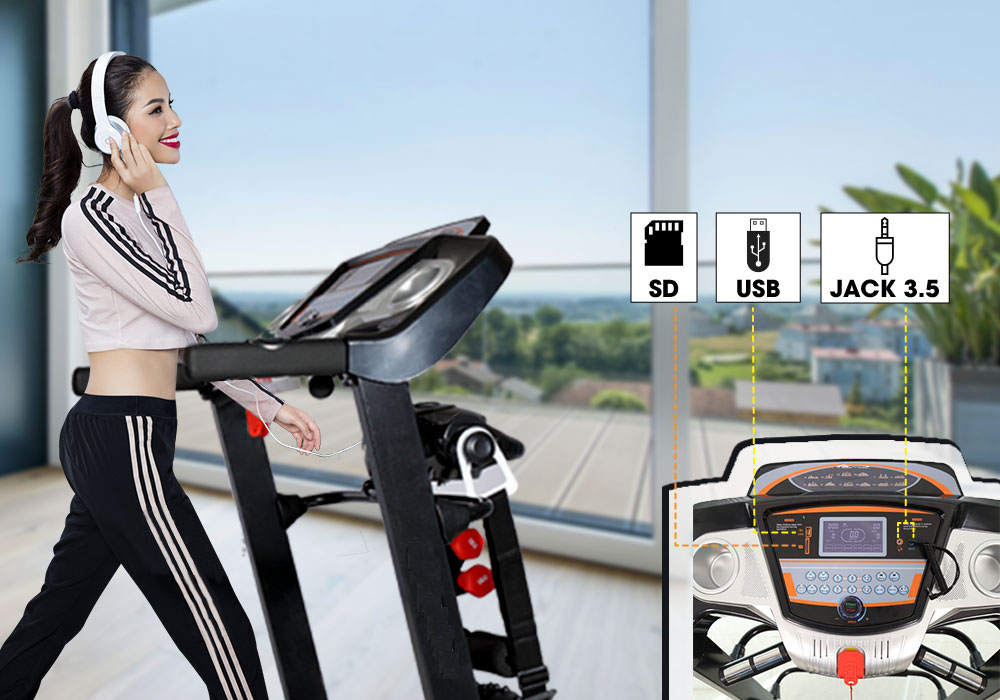 Với thiết kế hiện đại, máy chạy bộ điện đa năng SU - 619 giúp người sử dụng có thể trải nghiệm âm nhạc tăng hứng thú luyện tập bằng 3 cổng kết nối thẻ SD, USB và jack cắm 3.5. Vừa chạy bộ vừa nghe nhạc giúp tinh thần hứng khởi hơn, luyện tập hăng say và hiệu quả cao hơn.