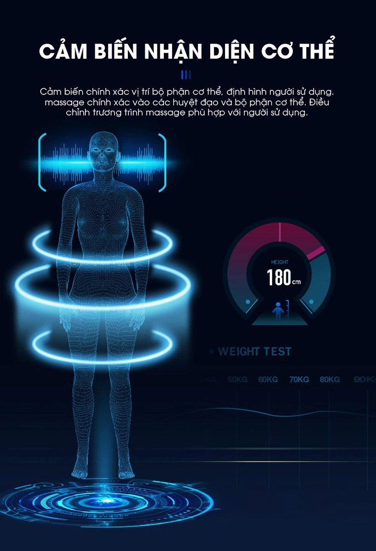 Ghế massage OKW-662 tích hợp chế độ Scan body đo toàn bộ cơ thể, phần chân ghế sẽ kéo dài, mở rộng để phù hợp với kích thước của người dùng. Từ đó sẽ đưa ra gợi ý các bài tập và cường độ massage thích hợp cho từng đối tượng. Ngoài ra, chế độ scan body còn giúp xác định chính xác vị trí vai với hệ thống con lăn di chuyển từ trên xuống dưới đến vùng vai.